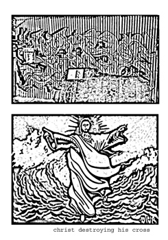 increase the love energy already extending past the boundaries of my animated body- I can now feel it hovering, buzzing around the bottoms of my forearms. *** Called "Struggle with the Immense" it's around this time that my mind works (taking a knee at the intersection of the LA river and Main Street) The ribbon keeps dropping and the strands keep pulling. It's all related and all gets related to the immense weight hanging above the surface of the water. There's an immensity in the city that I'm not sure what to do with- in the face of it, my heels dig in and I instantly am on the floor, disoriented and determined not to get up. I have a vision of my head smashed in and squished, and how ugly and frightening I must look- then I have a dream that I should put on that white beenie and wear it like a hole-less balaclava with a polka dotted chicken-style tie. That would fix my appearance- nobody would be able to see the results of my run in with the immensity of this liquid city. Called "On Antonio Villaraigosa" Here is the program! I heard that on an old record that Jesus gave to me. Here is the program and meet it with a good conscience. Here's how I differ from Antonio Villaraigosa. Antonio's bones are locked and fully articulated. His nervous system is likewise made of a reticulated hard matter, barely like a flowing ribbon but enough so to let him stream in and out of time and space. There's a blind spot that he has, and that's the spot of him that is spurring him on, around in furious loops, around and through in a constant almost insect like movement. His conscious mind is made completely of bone spurs. My bones are spreadable and soft, undeveloped. The rest of my tissue is made of nothing substantial enough to mention, less than liquid, less than colloid, an emulsion, more like an avocado- fatty and smooth- flying through intense experience faster than is imaginable- instantly reduced to a pitiful smear on the floor, I pour through the hard ear canal of Antonio Villaraigosa and out the pores of his neck. He smiles at the right time with his marionette like nervous system arching way above his shoulders. *** Called "Thoughts on Putrefying Hand" Thoughts on the Spreading and Decomposition of the Magician's Hand While Putrefying Eyeballs at High Velocity and a Generalized Dissemination and Intersection of White Sun and Red Moon Illuminate Said Putrefication *** Called "Thoughts on deconsecrated church in Soto and 6th Street" I heard that this church was deconsecrated and that a woman was living in here without paying rent... You swallowed it, it filled your lungs and stomach, and now you see more clearly what the architecture of this dilapidated building really signifies, you're seeing the poetics of the edifice more clearly: Any ghost is a friend of mine... ...a black silhouette of a figure walkign on damp concrete riverbeds This is a profound experience *** Called "Dream Buildings" Dream edifices exist in South LA as they do in all neighborhoods that value the individual's eccentric liberation and where lack of resources and capital prevent demolition, monitoring, safety code checking of buildings too eccentric, too revelatory, to be accepted in wealthier neighborhoods. They are invariable abandoned, never fully demolished--they stand as monuments to artistic, utopian and idealistic times; but also as activators of space, tottering receptacles and antennae of push-down, pull-out eccentrics operating in their own localities. *** Called "About the Past" Response to a question asked of Eufencio about his past during a conference at Lincoln Park, 1999 There's always more to say about the past... I began the journey home away from the book lined apartment and something leaked, then poured forth I didn't know what it was but traces of her makeup's scent traced across my face At that moment, she makes me the high-priest of this industrial city Newton abandoned the ease of the sciences he invented for the priesthood of alchemical experimentation I awoke in a small apartment, shook the dust off my shoulders: Things appeared luminous and in the process of transmutation So I went somewhere. A city full of energy and all manner of living things. I saw a roll of the dice, a white cat with a black tail These are my last words... These could always be my last words--the cabin fills with warmth The city was animated with biological matter. Things like dust and concrete had their own life. I walked overwhelmed through industrial parks, discovering that normal things now had different names. I understood this world at last. I achieved a temporary unity as a living thing among living things: If one's thirsty, drink the red lacquer of fenceposts The city rests on moth's wings That's all... Or, we're thrusted concrete thrusts being thrust and pulled by momentum of flapping wings and batting eyelids We test our children like we train administrators and those with skill enough to fail the test magnificently go on to build dream edifices. Buildings in the shape of cat's heads, water drops, angles of illusionistic smoke, curves that can be distilled into cocktails that will dissolve their own walls. *** Called "Gardiosity Principles" We create grandiosity on a larger scale through three principles: 1.) a2+b2=c2