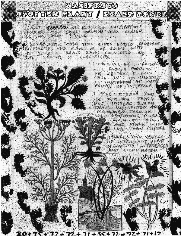 ![]() | (abstract) It doesn't matter what the hallucination looks likes, it matters the sentiment of the reaction to the confrontation or meeting I once wrote to debunk hoaxes and myths, but as I progressed on each debunking project, I would become more and more confused. I realized that the sighting of anomalies was by nature and definition anomalous. Furthermore, I realized that all anomaly is really variation. I began to see all variation and change as anomalous and in consequence many mundane things in the world; flowing water, growing hair, roadkill, movement of bodies, acceleration and even stasis became as odd and frightening to me as mothman, chupacabra or cattle mutilation. And slowly, my recognition of the anomalous spread to include more and more the the things around me until everything that filled my senses was foreign and struck terror in me: a boy's head cracked by a policeman's fist, my voice slipping across the wind, Lopez-Feliu's hair growing year by year, iron against lubricated iron, a skyscraper falling in a pile, the rapidly worming distances between my eyes and distant views... All is now in flux and changing, everything is anomalous and hoax; even the hoax and story of gravity only dictates one direction of many directions and can be called into question as readily as the mothman hoax--our blood flows up and down, across and back, pumped by a strange hoax--the heart muscle, flowing through strange mythic channels called veins. These words follow a mythical set of systems to become a strangely manifest hoax. The myth of dictated words in mythical symbols representing ideas (themselves anomalous and deceptive) laid down in quick drying hoax-ink on a mythical and unprovable substrate. This paper that you hold in your hand and the content on it and the brain functions that lead you to understand it are all unprovable hoaxes perpetuated by over-active imaginations susceptible to the influence of myth. "On", "over", "on top", "based on"... all orientation and relation is ghostlike and anomalous. Directionality and placement, composition and divine order are hoaxes and mythologies. We exist and ultimately are mythical- like a play with no director or audience, no script or stage, no actors, no props... for reference please see mirror scene in Duck Soup, mythical movie from the hoax year of 1933. A building a Dream Building is called many different things, it's not know what i talk about, i have dreams about buildings that use solar energy to grow, my house shit last night in a vision, my house followed angles whose angles they angeled, it was AFRO-SPACE, CHICANOSOL, bio-FRIENDLY, uTOPian centeRED, i grew vegetables outside but the house was a vegetal being, it ate vegetable and fertilized its own roots, my house had INPUT/OUTPUT, my house had memory and cells, cellular stoicism and buzz, it had bite, fucking beatiful heart-house, interplanetary solidarity and loves-node of the cosmos, product of highness and maHnia I got scared of blooming inspiration shocked my eyes opened and closed gliding and sliding We are little more than exotic beaded creatures encrusted and made up of single unite of colorful round balls connected by the thread of electricity I shouldn't be worried with enough food in my system I can call on the highness of inspiration at many points of interface I face its face and see not one thing but instead every thing integrated and mainlined through sensations more akin to touch and more wisp-like than memory Tendrils and vessels of intelligent plant organism interface and coordinated |